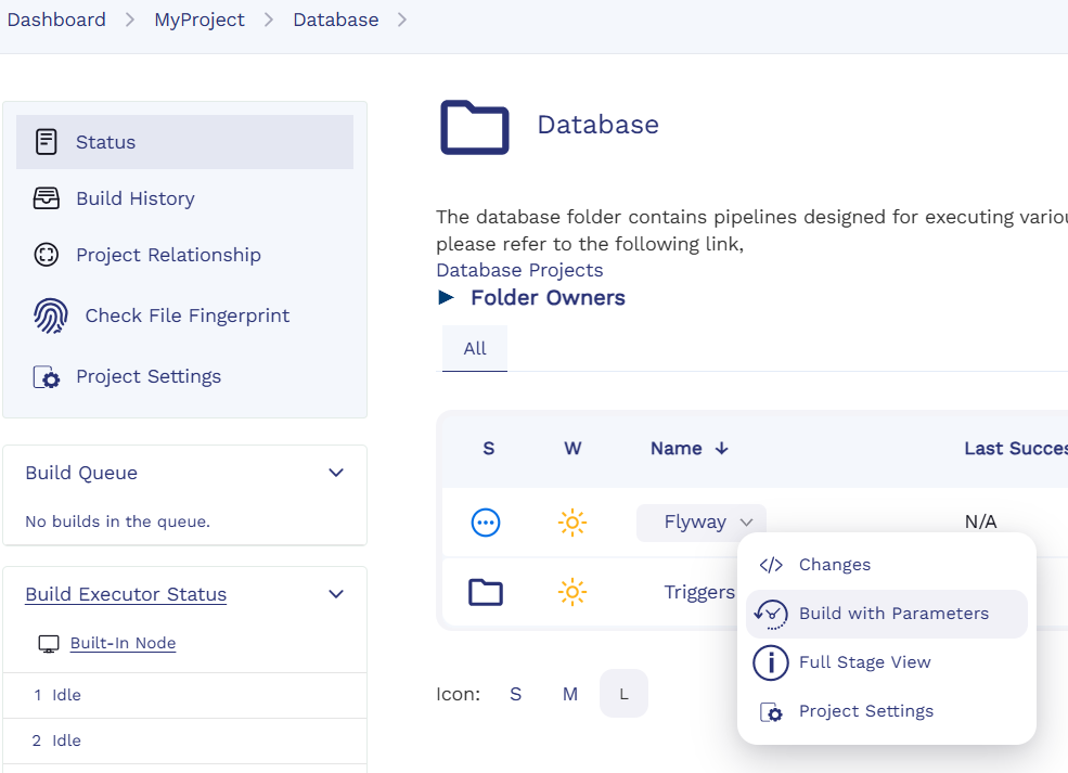 - In the Triggers folder, click the build icon for the createFlywayTrigger job.