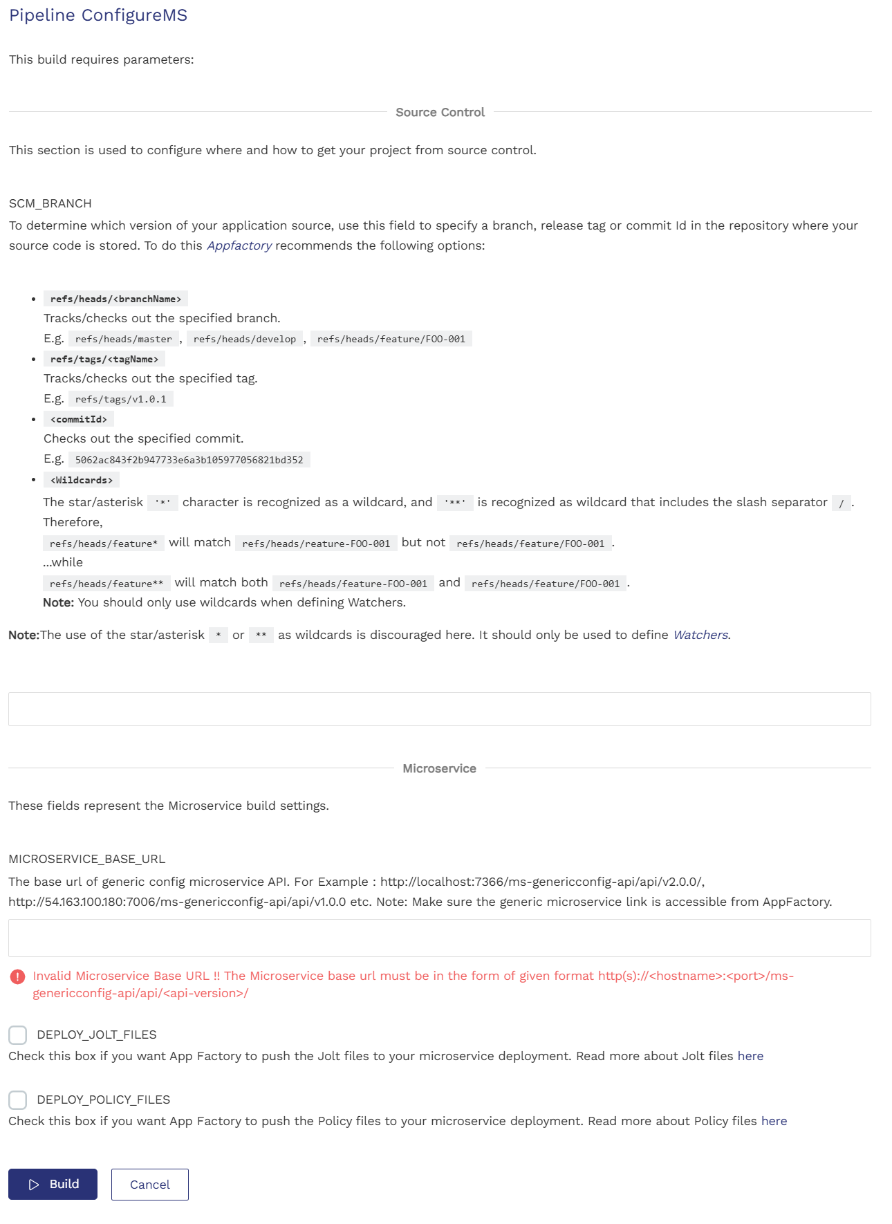 To build and deploy Microservices, you need to run the ConfigureMS job. When you perform a build for the first time, you need to configure the build settings. App Factory stores the settings from the build to make configurations of the future builds easier by providing the Rebuild option.