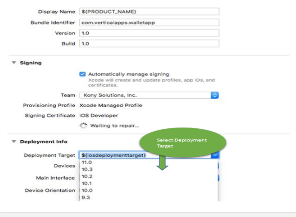 For example, if you have installed Kony Visualizer 7.3 on your Mac machine. You follow a few manual steps to build the IPA by extracting the KAR on your Mac machine. During the IPA generation, you perform additional manual settings in the Xcode project to change the deployment target as shown in the following image.