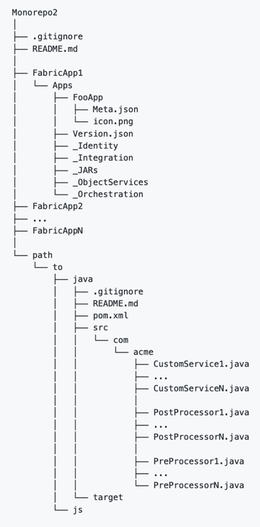If you want to integrate Java assets from the source code into the Fabric app, you can migrate to one of the Monorepo structures that are mentioned earlier in this section. With the Monorepo strategy, you can easily track and use the buildFabricApp pipeline. You can use Git commands to retain the commit history while migrating to the new structure.