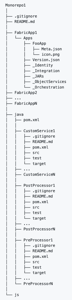 A common practice to create a repository is to use a Monorepo strategy. A Monorepo for App Factory may contain different sub-directories for different Fabric Apps and their Java dependencies, such as Preprocessors, Postprocessors, and Java services. The Monorepo can also contain Maven configuration files (pom.xml) to manage the Java assets and compiling the source to generate binaries.