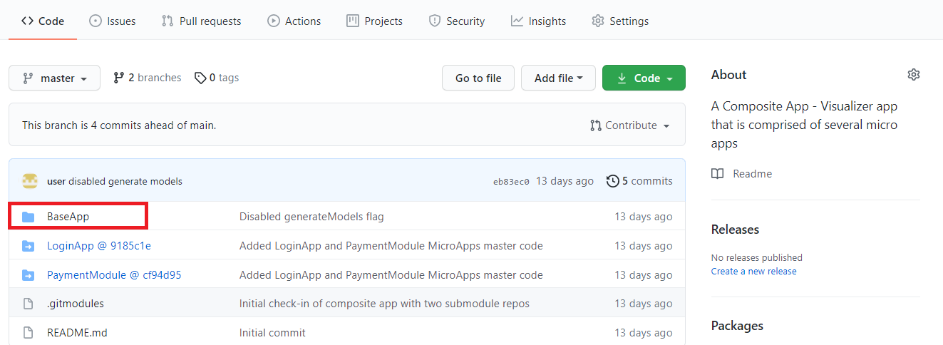 IMPORTANT: For the submodule repository approach, make sure that the base app contents are versioned in a separate folder at the root level of the repository.