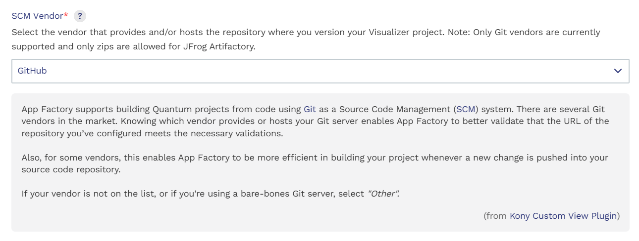 Specifies the Git vendor that hosts your repository. Select the option that matches your Git server. App Factory supports GitHub, Bitbucket, AWS CodeCommit, and JFrog Artifactory. If your Git vendor is not in the list, or if you're using a bare-bones Git server, select Other. IMPORTANT: