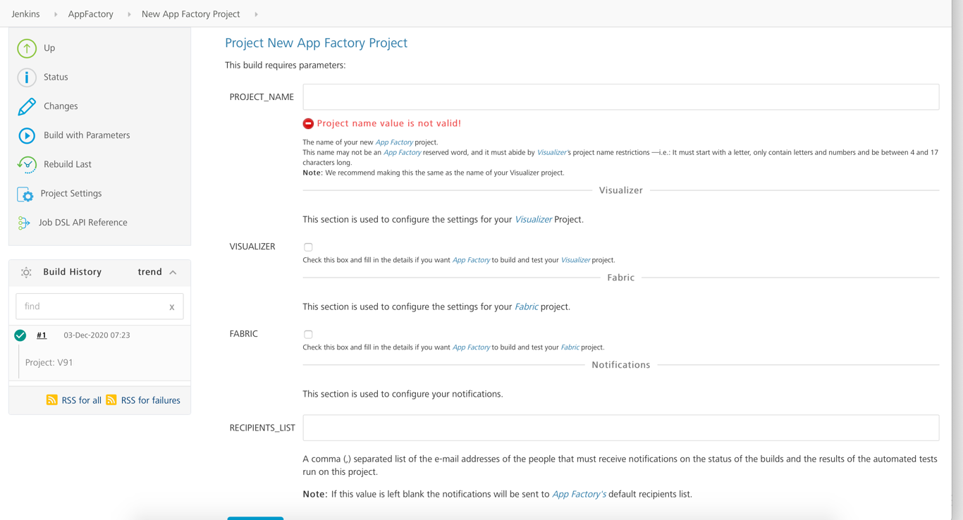 With every release, App Factory introduces new features or fixes. To use the new features in existing App Factory projects, you need to upgrade the projects by recreating them with the New App Factory Project option on the left panel of your App Factory Console home page. From V9 ServicePack 2, New App Factory Project has been updated to contain just one parameter, PROJECT_NAME.