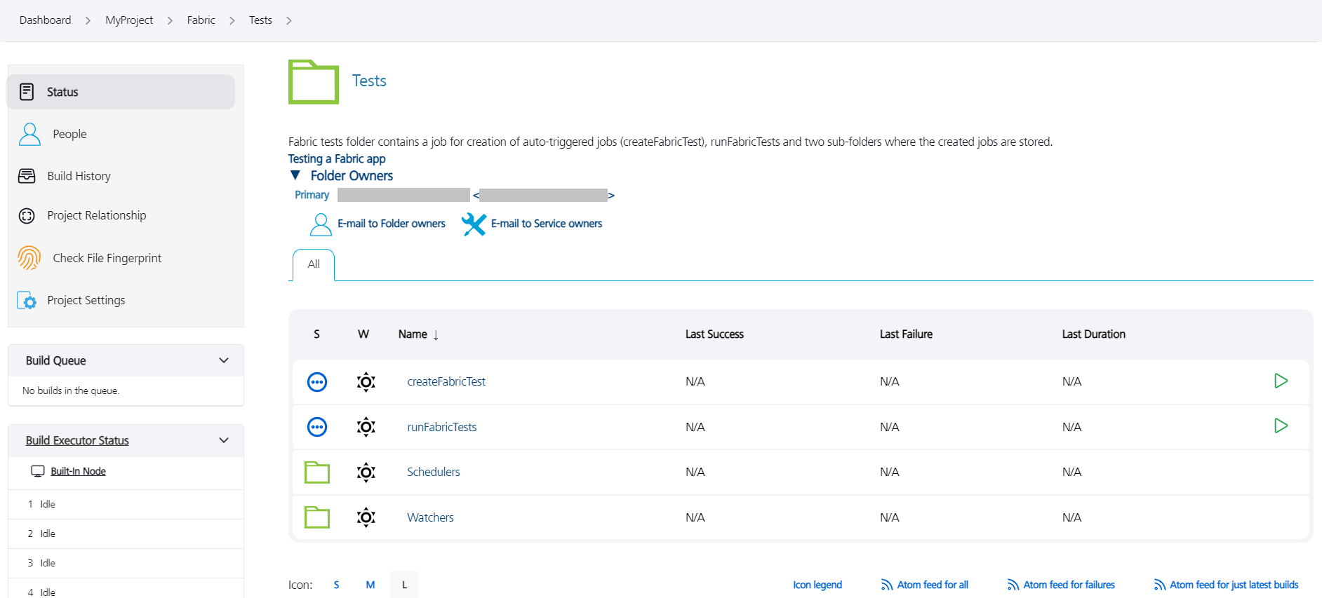 The Triggers folder contains the createFabricAppTrigger job, which creates a trigger to perform a build based on a schedule or based on a push to the source code. There are two sub-folders that store the created triggers based on the trigger mechanism.