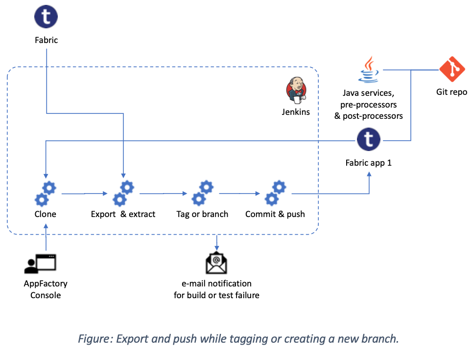 The following section contains information about how to run, build, and deploy a Fabric app by using the App Factory CI/CD process. After the build is completed, an email notification is sent about the build result with information about the build artifacts, changelog from the Git tool, and build settings.