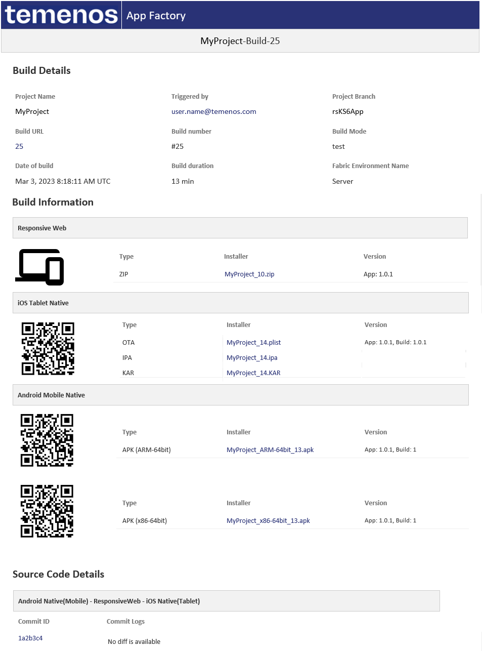 - QR Codes: From the 202305 release, the emails contain QR Codes to download and install app binaries on your client devices. The QR Codes are also available on the artifacts page of the build job.