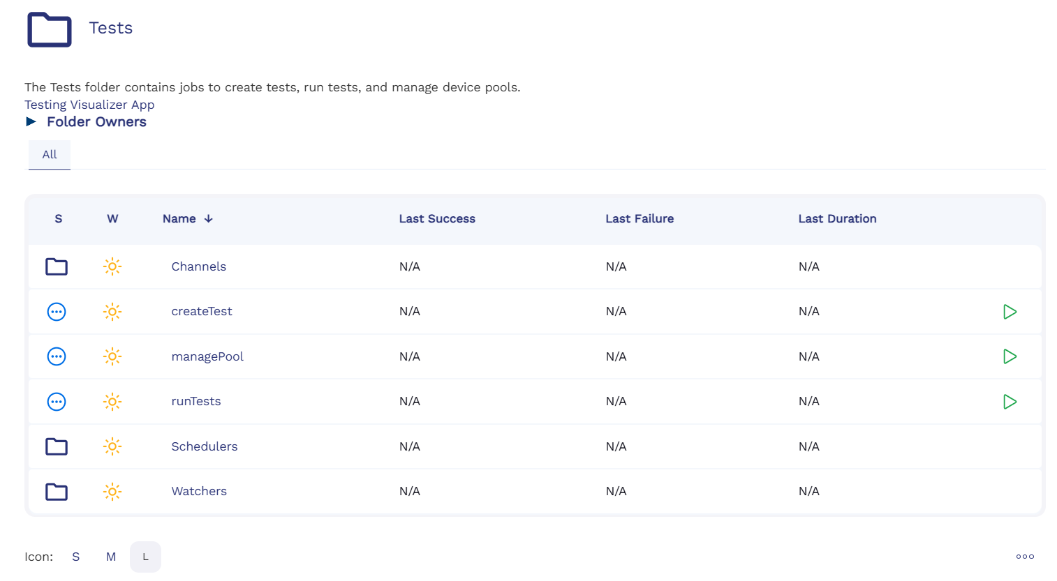 The Tests folder contains jobs to create tests, run tests, and manage device pools. It also contains sub-folders that store the created tests based on the trigger mechanism.