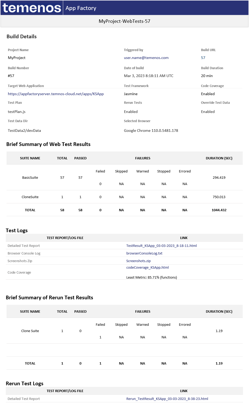 If you enabled rerunning of failed test cases, this section contains a brief summary of the rerun test cases. If you enabled code coverage for your tests, the brief summary contains a Code Coverage Report.