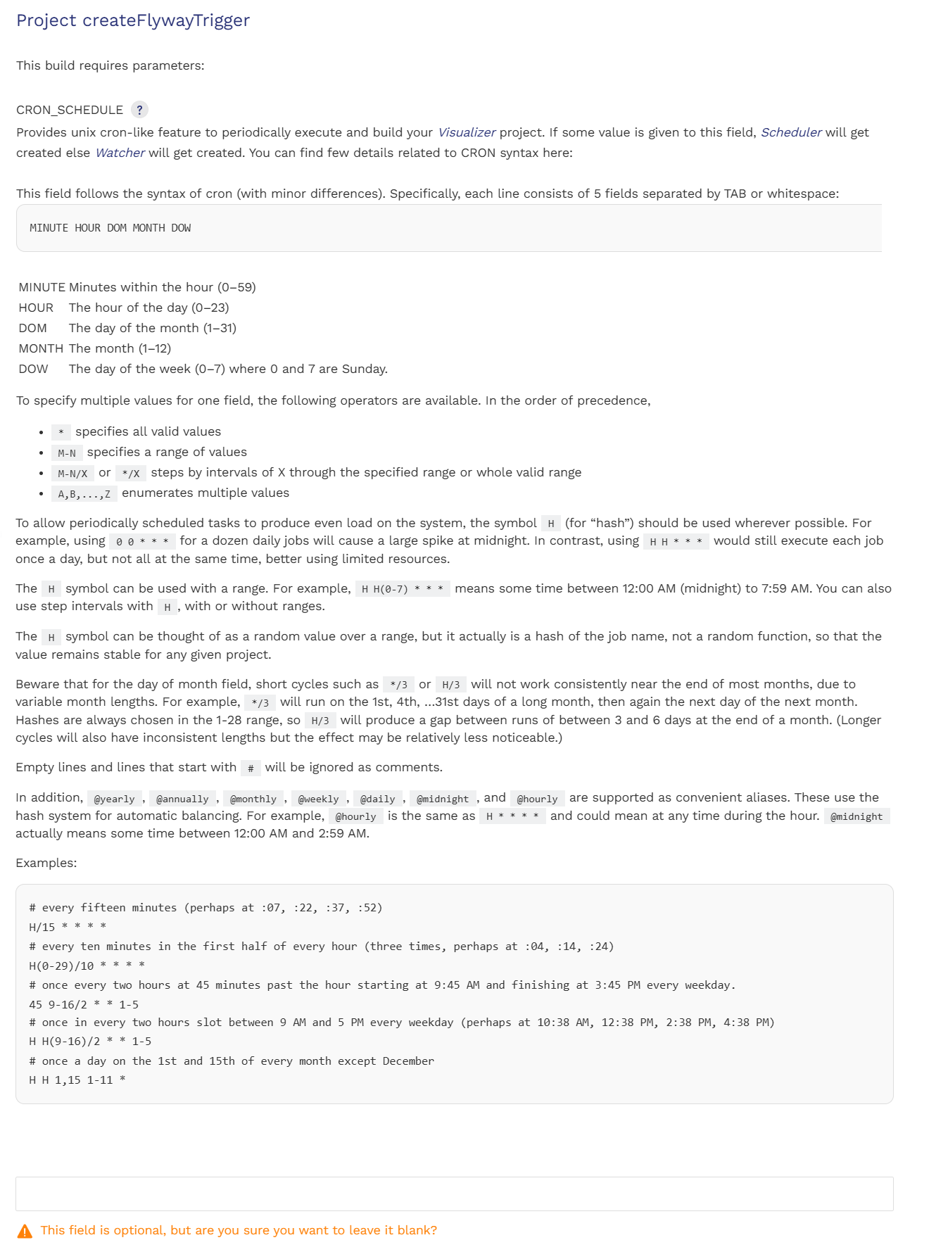 Alternatively, open the drop-down menu for the createFlywayTrigger job, and then select Build with Parameters. - Use the CRON_SCHEDULE parameter to specify the schedule on which the build job must be triggered.