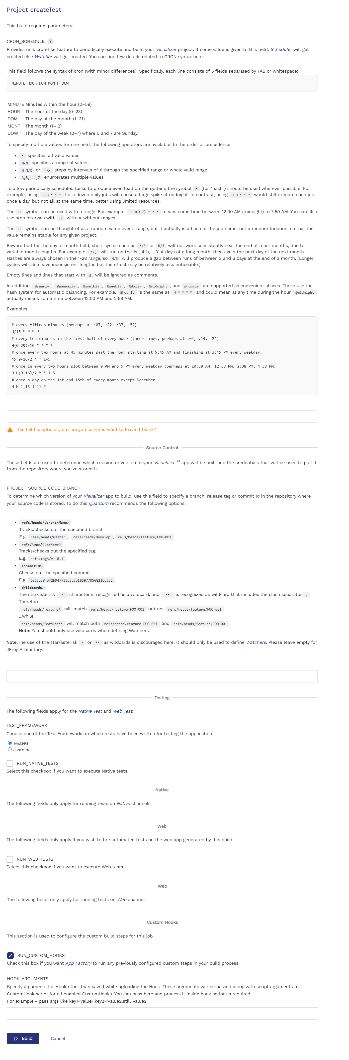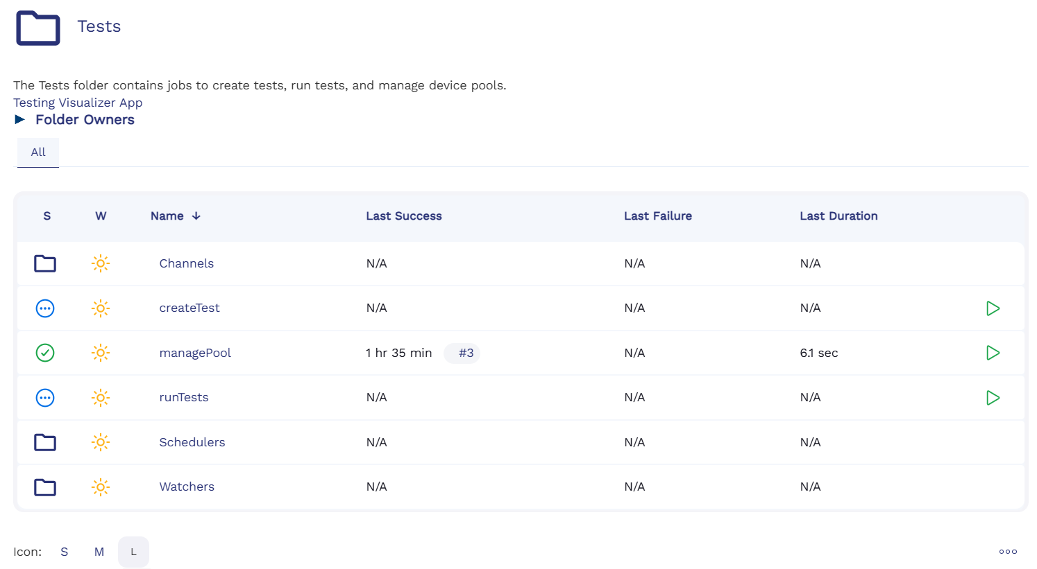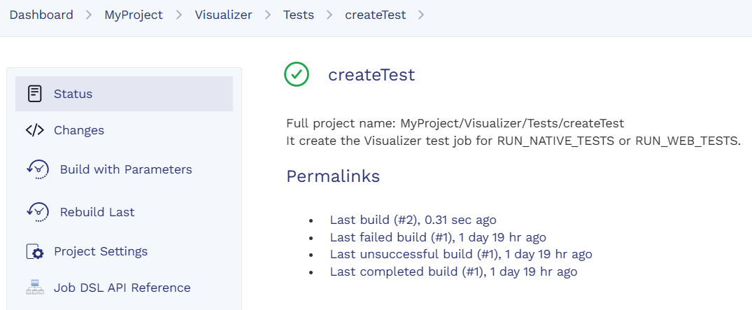 You can also trigger the tests from the buildVisualizerApp job available at Project Name > Visualizer > Builds folder. It is the simplest way to validate your code by launching tests right after Building the application. There is no need to specify all parameters as they are provided while running the tests manually. The results can be viewed in line to the Test Results of Manual Tests. For more information, refer to Building a Visualizer App.