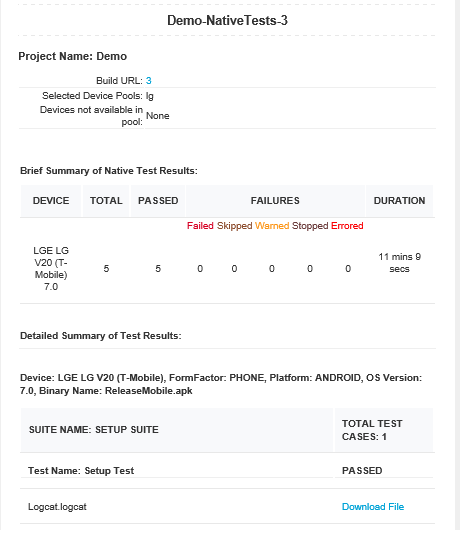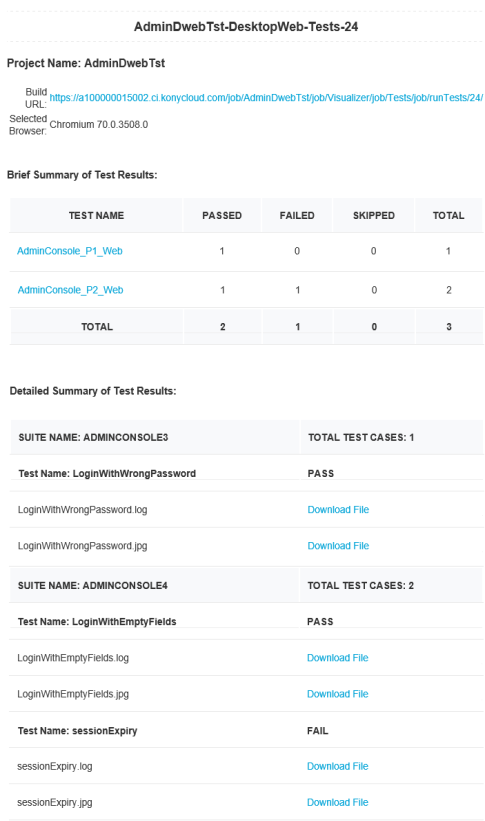 To download the log files for each test case, click the respective Download File link. If you have any test failures, you can use these files to debug them.