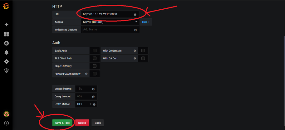3. In the URL text box enter the URL to access Prometheus http://<MASTER_NODE_IP>:30000 and click Save & Test.