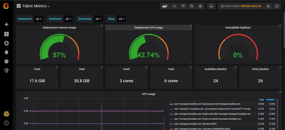 After the installation is complete, the Grafana service is available on node port 30400. The Grafana dashboard can be accessed with any one of the master IPs. Credentials to access the dashboard are: