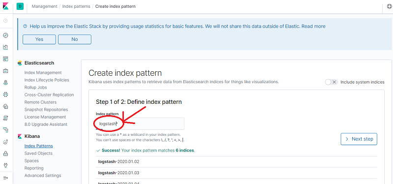 4. Enter logstash* in the Index pattern text box and then click Next step.