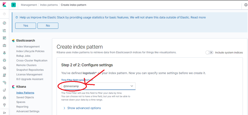 5. In Time Filter select @timestamp and then click Create index pattern.