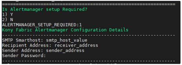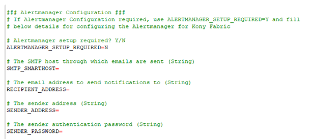 The SMTP configuration is present under the email_configs section under alertManager configmap in kony-fabric-monitoring.yml file. Update as required and run the following commands to apply the changes: