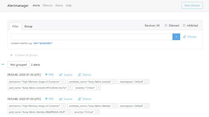 After the installation is complete, the Alertmanager service is exposed to nodePort 30500. The Alertmanager Console can be accessed with any one of the master IPs and will be as follows:
