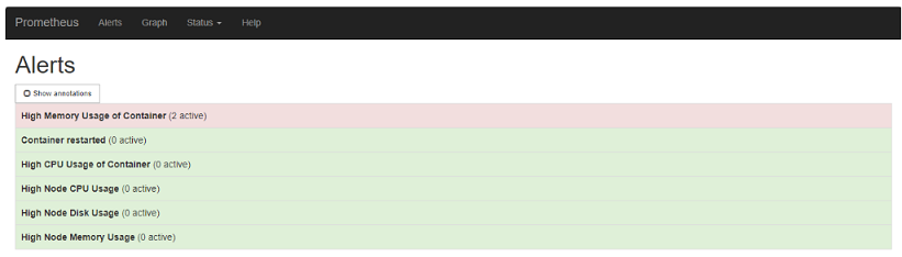 To see the alerts which are in the pending or the firing state, go to the Prometheus console using http://<MASTER_NODE_IP>:30000 and go to the Alerts tab.