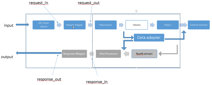 For the request that is coming in to the mapper, after basic URL parsing and ODATA parsing are performed, all the context is made available to the request mapper. The request mapper modifies the payload and sends it into the next stage of the pipeline, which goes to the back end, typically by using an integration connector.
