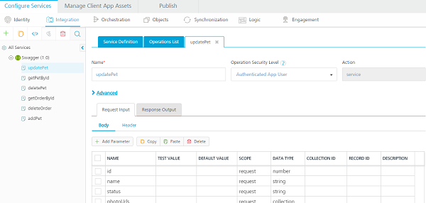 After you create a service, you can view the existing operations and also create operations on the Operations List tab. For an OpenAPI endpoint, the operations are the paths that are defined in the Swagger file, for example: addPet or updatePet.