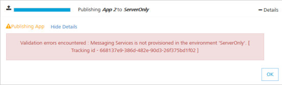 For example, if message services have a wrong data configured in the app, the system does not publish this stage and throws the following error:
