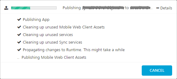 When you enable synchronous publish, the UI in the Console remains blocked until the initiated operation or app publish progress is finished. As the user interface (UI) is blocked, you cannot perform other actions in the Console such as creating or modifying other apps and services.