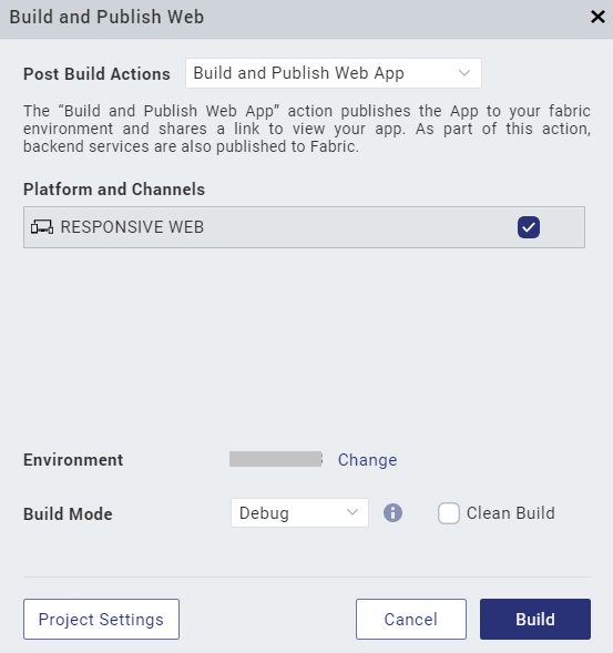 The Build and Publish Web window appears. - Under Platform and Channels, select Responsive Web.