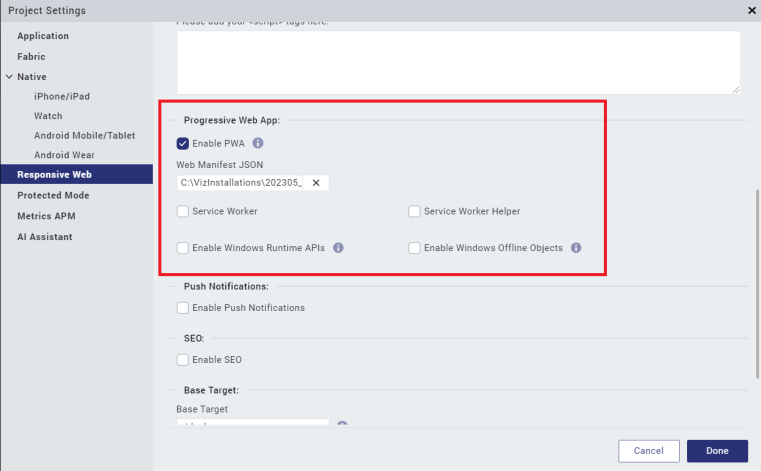 The Responsive Web settings appear. - Under Progressive Web App, select Enable PWA. The Web Manifest JSON field appears.