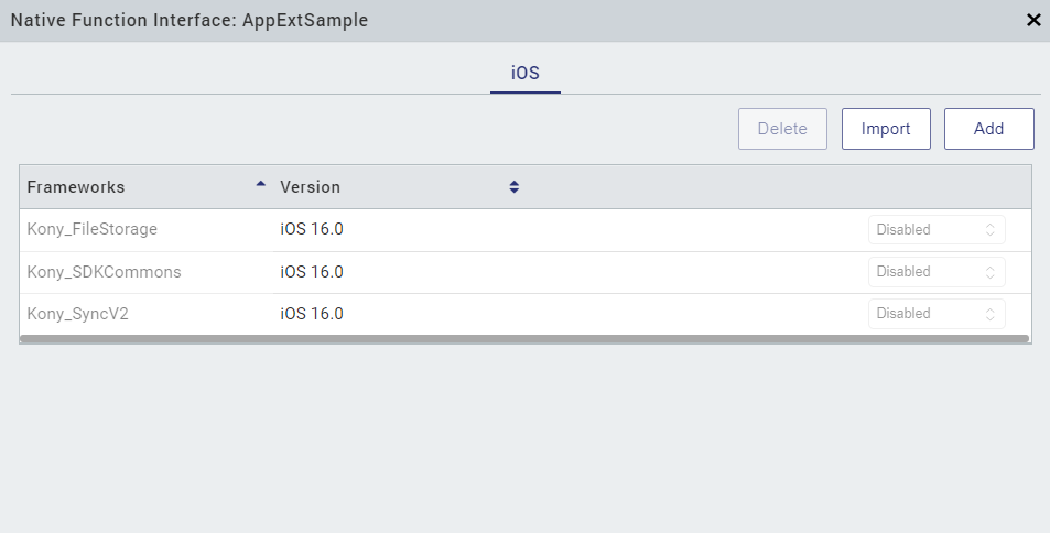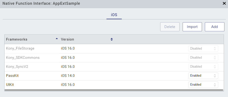 Refer Manage Native Function APIs of an iOS Application Extension for information on adding or importing NFIs to an Application Extension.