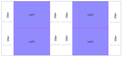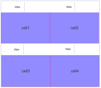 GutterX: The GutterX property provides horizontal spacing (on the left and right of a widget) between the child widgets of the Responsive Container. The value for the GutterX property must be provided in px, dp, and % units. For example, if you provide a GutterX value of 10 px, the spacing is applied as follows: