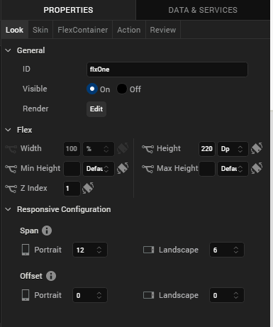 Span and Offset properties override the positional and width properties of a direct child widget. Therefore, in addition to the Span and Offset properties, you can only configure the following Flex properties for the child FlexContainer widget of the Responsive Container: