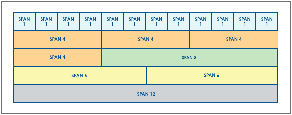 The Responsive Grid layout divides the container widget into columns based on the value of the Span property. The maximum number of columns is twelve. The Span property sets the width of the child widget based on the 12-column layout. The Offset property determines the position of the left edge of the widget. This position is measured either from the left edge of the parent widget or from the right edge of the widget present to its left.