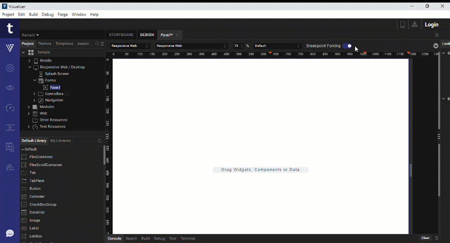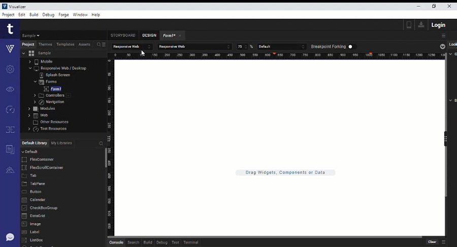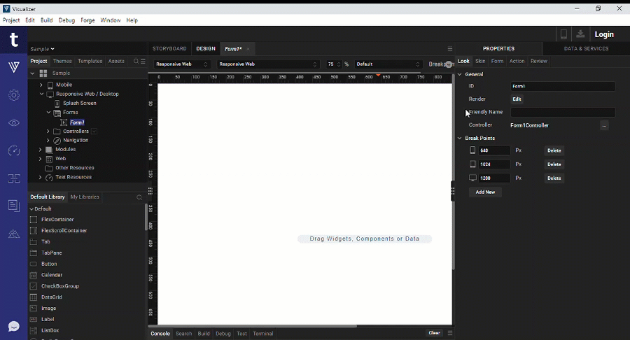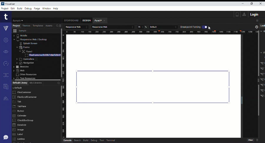 Tip: You may want to set the view of Canvas to 75%. Setting the canvas to 75% view makes it easier to navigate through three different breakpoints. - Drag and drop a FlexContainer to the form.