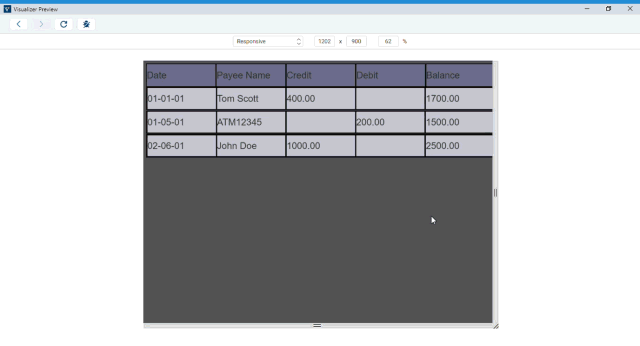 When the same list is viewed on a mobile device, you can modify the row template and data properties to show only the payee name and transaction amount. This provides a better user experience as the user can view the full list easily.