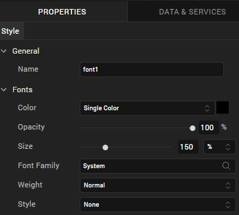 Using the Style Constant for Fonts, you can configure the Color, Opacity, Size, Font Family, Weight, and Style for a font. The changes made to the style constants are applied instantly in the project.