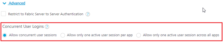 - Click the Advanced section > Concurrent User Logins section, select one of the following options: