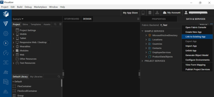- Now, Click on the DATA & SERVICES tab (top right), click on More options, and select Link to Existing App. The Fabric Applications screen appears.