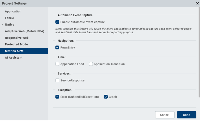 - Under Project Settings, click the Metrics APM tab, select the Enable automatic event capture check box.