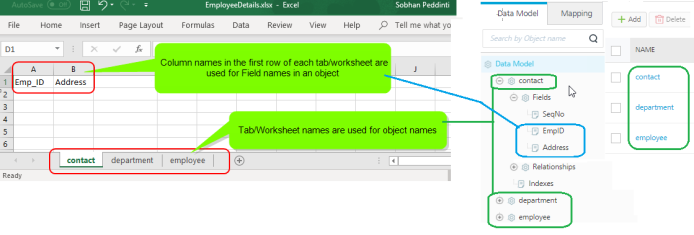 - Column names in the first row of each tab/worksheet are used for fields names in an object