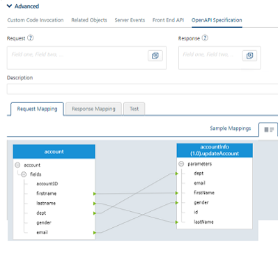 • In Response > XML MapperaccountID and dept fields of the object data-model are configured using OpenAPI Specification. You can specify multiple fields names separated by a comma. Utilizing the OpenAPI Specification feature is essential here to display correct parameters for your API.