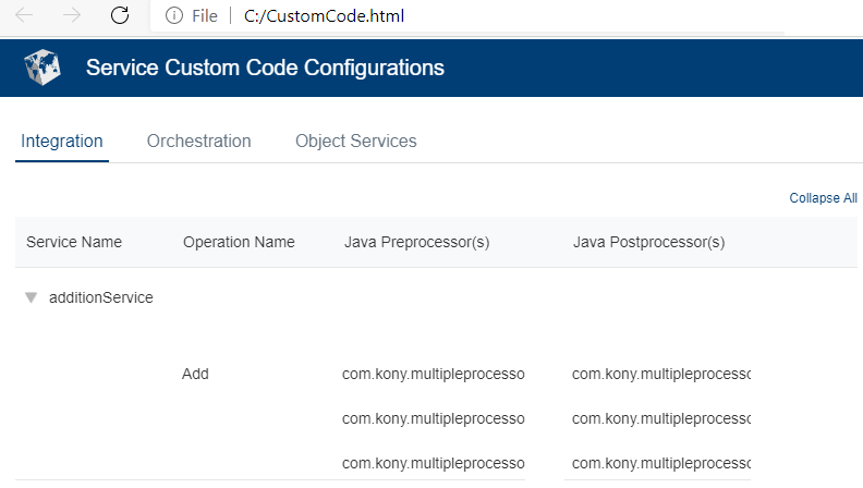 When you click Download CustomCode Info, all the associated data of Java pre and post processors in the app is exported to a .ZIP file (appname.zip) and the zip file is downloaded to your local drive. The zip file contains the CustomCode.html file that contains Service Custom Code Configurations for Integration/Orchestration/Objects in an app. You can navigate to each of the tabs and view the details. The Expand/Collapse All options allows you to view the entire list of details in a tab.