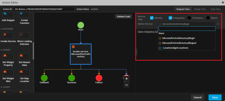 - Click Save. An action sequence for invoking an Identity service is defined in the selected widget.